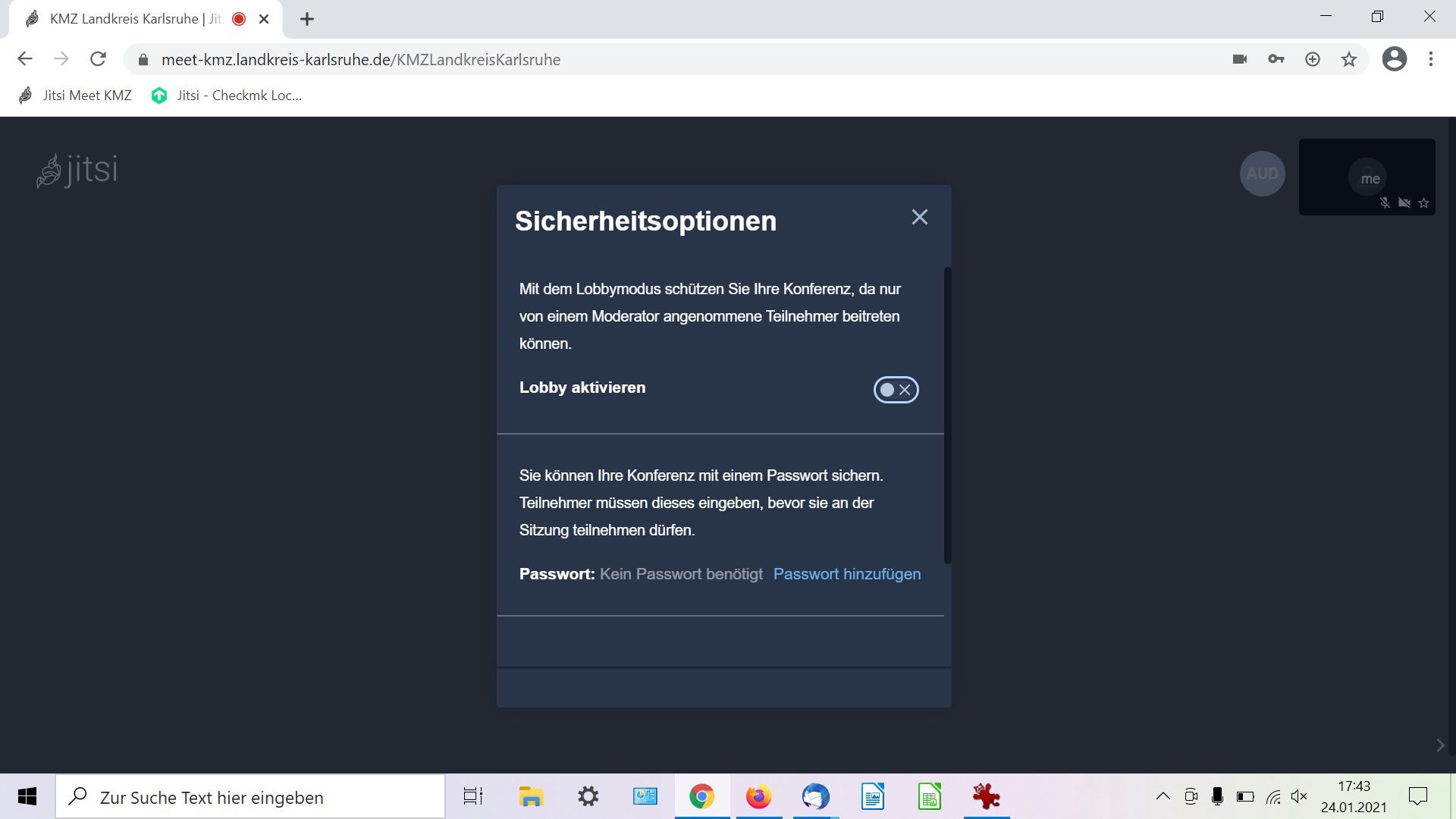 nach einem Upgrade unserer Server steht Ihnen nun beim Zugang zu meet-kmz.landkreis-karlsruhe.de - über einen Browser (wir empfehlen weiterhin Chrome) - eine neue Funktion: der Lobbymodus zur Verfügung.